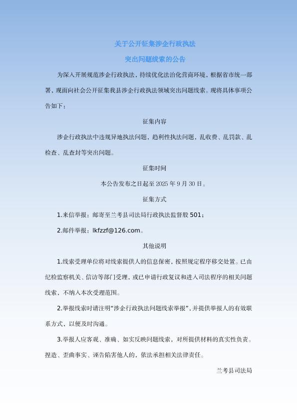 關(guān)于公開征集涉企行政執(zhí)法突出問題線索的公告